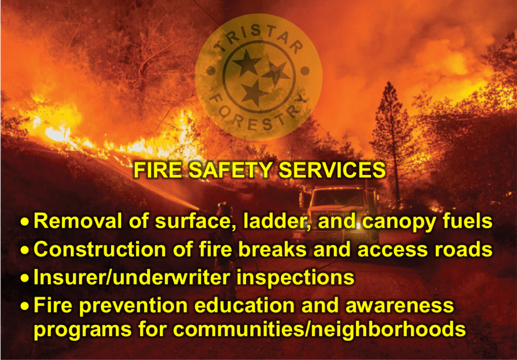 Tristar Forestry offers fire safety services that reduce the risk of ignition and spread of fires in woodland areas, protecting ecosystems and communities. We remove/reduce flammable vegetation (fuels), create defensible space around homes and businesses, and educate the public to prevent accidental ignitions.